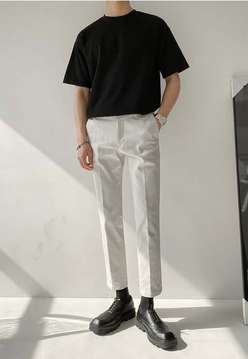 這身搭配以純色調(diào)黑白配,經(jīng)典搭配,不會錯的搭配,純黑色圓領(lǐng)短袖T恤+純白色九分休閑西褲,西褲的垂墜感讓整體更加利落有型,腳上搭配黑色皮鞋,質(zhì)感有型。點綴上手表和手鏈,給簡單的搭配,提分不少。