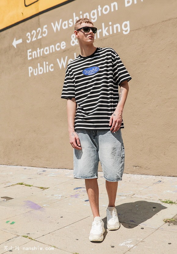 黑白條紋也是男生比較青睞的,青春洋溢,揮灑自如,牛仔短褲,小白鞋,搭上去更減齡。帶上墨鏡,起到畫龍點睛的作用,小哥哥不要太帥哦!
