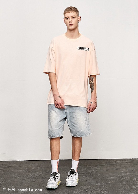 歐美潮牌寬松T血,粉色提升皮膚,看起來更白凈,搭牛仔褲,長筒襪,老爹鞋,別具一格,個性獨特。這個夏季這樣搭,一周每天不重樣,潮男就是這樣打造出來的。