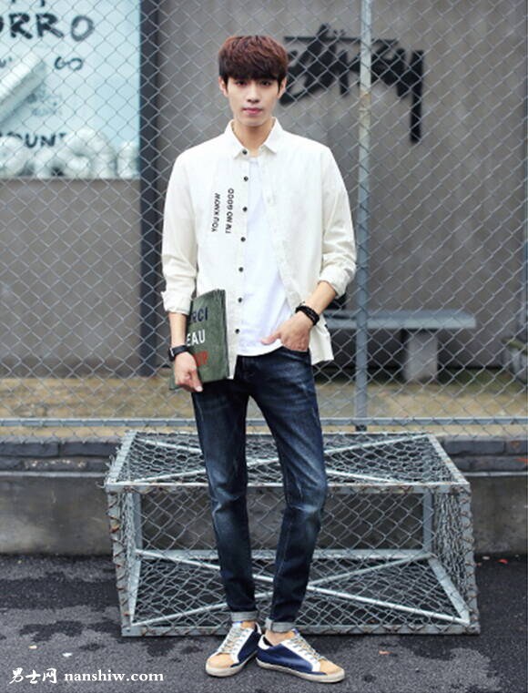 白色襯衣+白色T恤打底+深藍(lán)牛仔褲+拼色帆布鞋,帥氣利落有型,給人不一樣的觸感,彰顯青春活力。