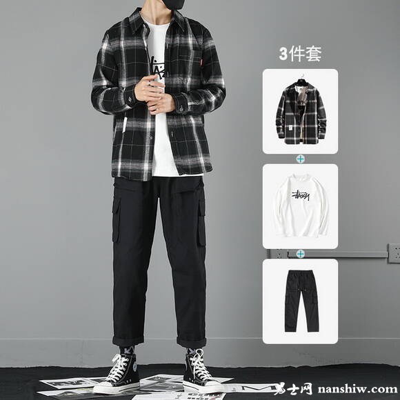 第四,格子襯衣+長(zhǎng)袖T恤+工裝褲