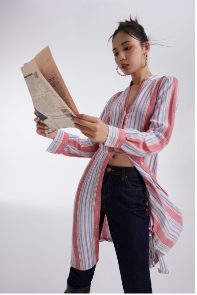 長款設(shè)計(jì)款襯衫,Brooks Brothers(布克兄弟)經(jīng)典配色與條紋視覺的碰撞,寬松隨意,卻又恰到好處地展現(xiàn)出女性的線條美。剪裁得當(dāng),寬松的廓形既舒適又不失氣場,讓穿著者充滿自信,展現(xiàn)出現(xiàn)代女性的力量。
