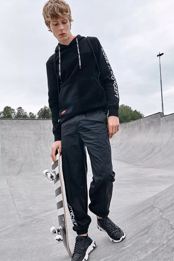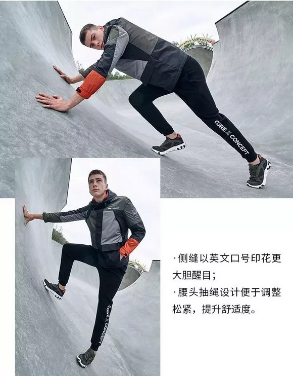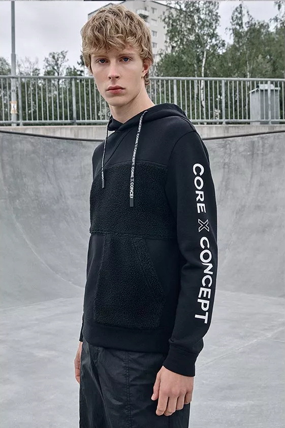 前側(cè)袋鼠口袋,字母抽繩上使用醒目印花設(shè)計(jì),以對(duì)細(xì)節(jié)的關(guān)注反應(yīng)功能性獨(dú)特考量。以標(biāo)識(shí)性口號(hào)印花【CORE X CONCEPT】表達(dá)對(duì)循環(huán)經(jīng)濟(jì)和再利用理念的聲援。這個(gè)秋天,用穿在身上的環(huán)保態(tài)度秀出己型!