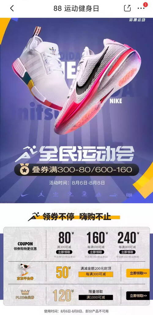 京東88運(yùn)動(dòng)健身日,全民運(yùn)動(dòng)會(huì):疊券滿300-80/600-160,各種券領(lǐng)不停,嗨購不止;滿900-240,滿1000減200的大額平臺(tái)券(限量),快來嗨購吧~