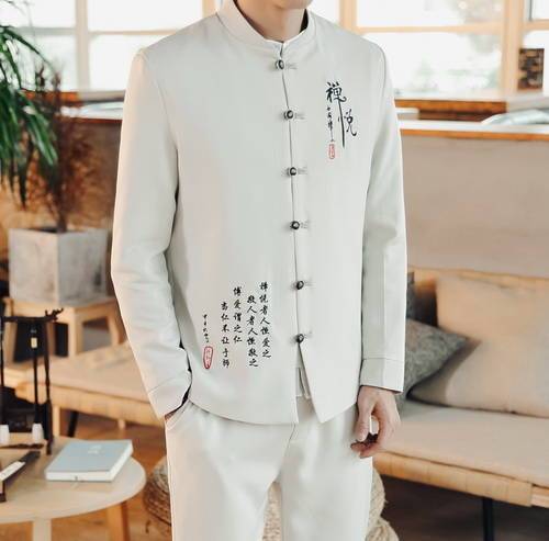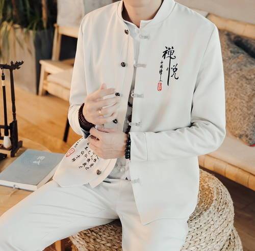 灰白色立領(lǐng)外套,中山裝設(shè)計,加上一些獨特的字母刺繡,如“禪”以及右下角的如詩的字,有種佛系的趕腳。整體顏色很純,加上版型寬松與垂墜感,修飾了身材,干凈利落,帥氣有型。