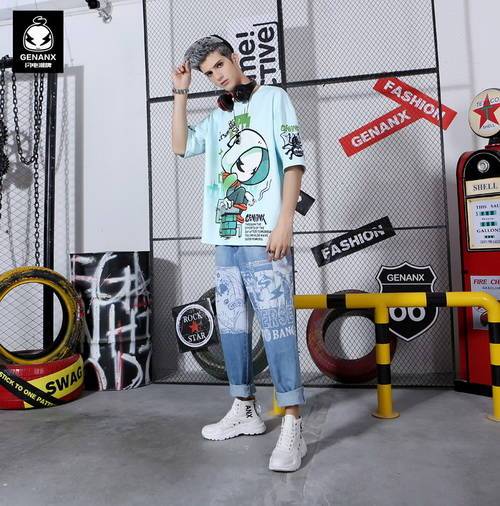 粉綠色閃電蜘蛛俠T恤搭配街頭嘻哈風(fēng)水洗藍(lán)印花牛仔褲