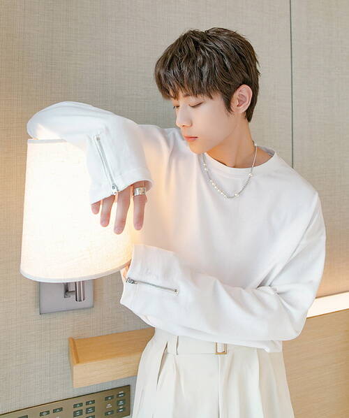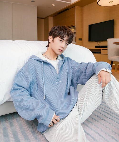 個性連帽運動款寬松長袖衛(wèi)衣搭配運動束腳褲(如下圖3),內(nèi)搭寬松圓領個性打底T恤(如圖4)