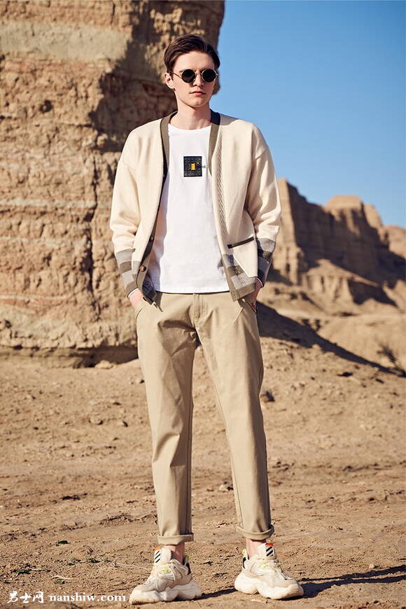 針織開衫+白色內(nèi)搭+卡其色褲子+運動鞋,整體拉長身材的比例,偏瘦的男生身材有所修飾,穿出來更有型,能夠穿出個人的氣質(zhì)。