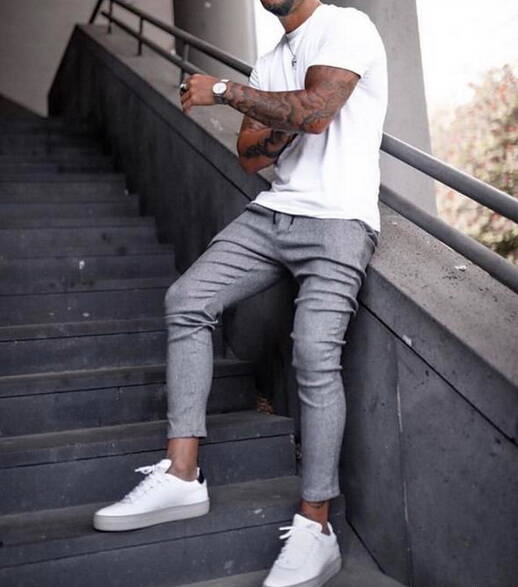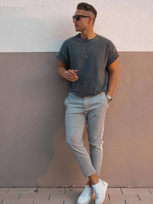 白色T恤是夏天最常見(jiàn)的單品了,結(jié)合灰色的西褲產(chǎn)品來(lái)進(jìn)行搭配時(shí),能夠給人以舒爽、干凈且雅致的感受,對(duì)比選擇黑色的褲子單品來(lái)說(shuō)會(huì)顯得平靜緩和許多,不容易給人燥熱感。