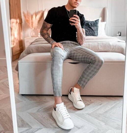 2、灰色格紋休閑西褲+黑色T恤