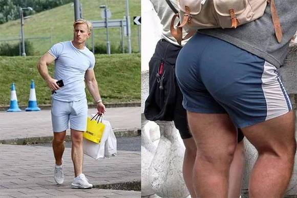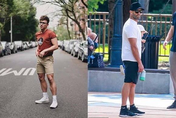 讓我們用身材非常粗勇的「The Rock」巨石強(qiáng)森來(lái)舉例:左圖中膝上短褲+低筒鞋款,露出了更多的腿部,相較于右圖中五分褲長(zhǎng)+高筒鞋款,視覺(jué)上的身材比例顯得更加高挑挺拔。